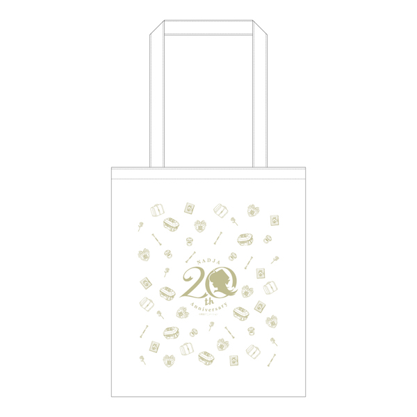 「明日のナージャ」20周年ロゴを中心に、作品に出てくるアイコンがちりばめられたデザインのエコトートバッグ。小さく畳めてコンパクトに持ち歩き可能。